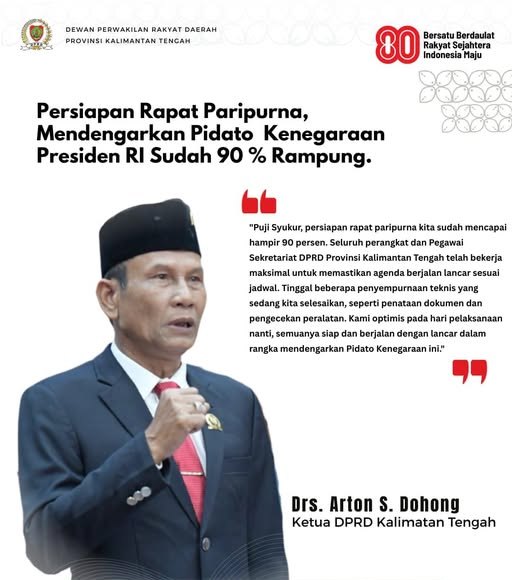 “Puji syukur persiapan rapat paripurna kita sudah mencapai hampir 90 persen,” kata Ketua DPRD Kalteng, Drs. Arton S. Dohong, Kamis 14 Agustus 2025.